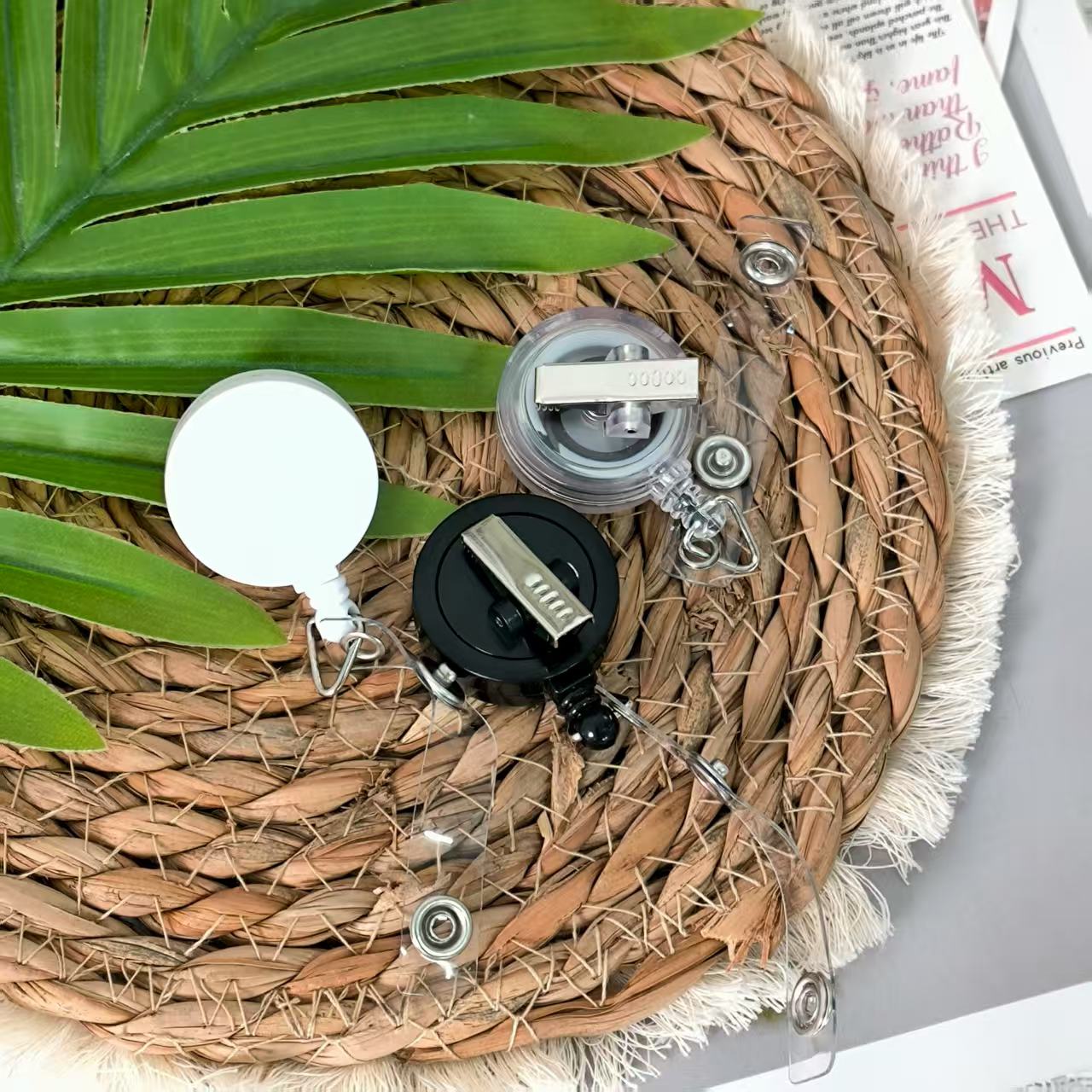 Plastic retractable clips rotating alligator clips Black and white stock available ID card pull tabs Factory badge hooks